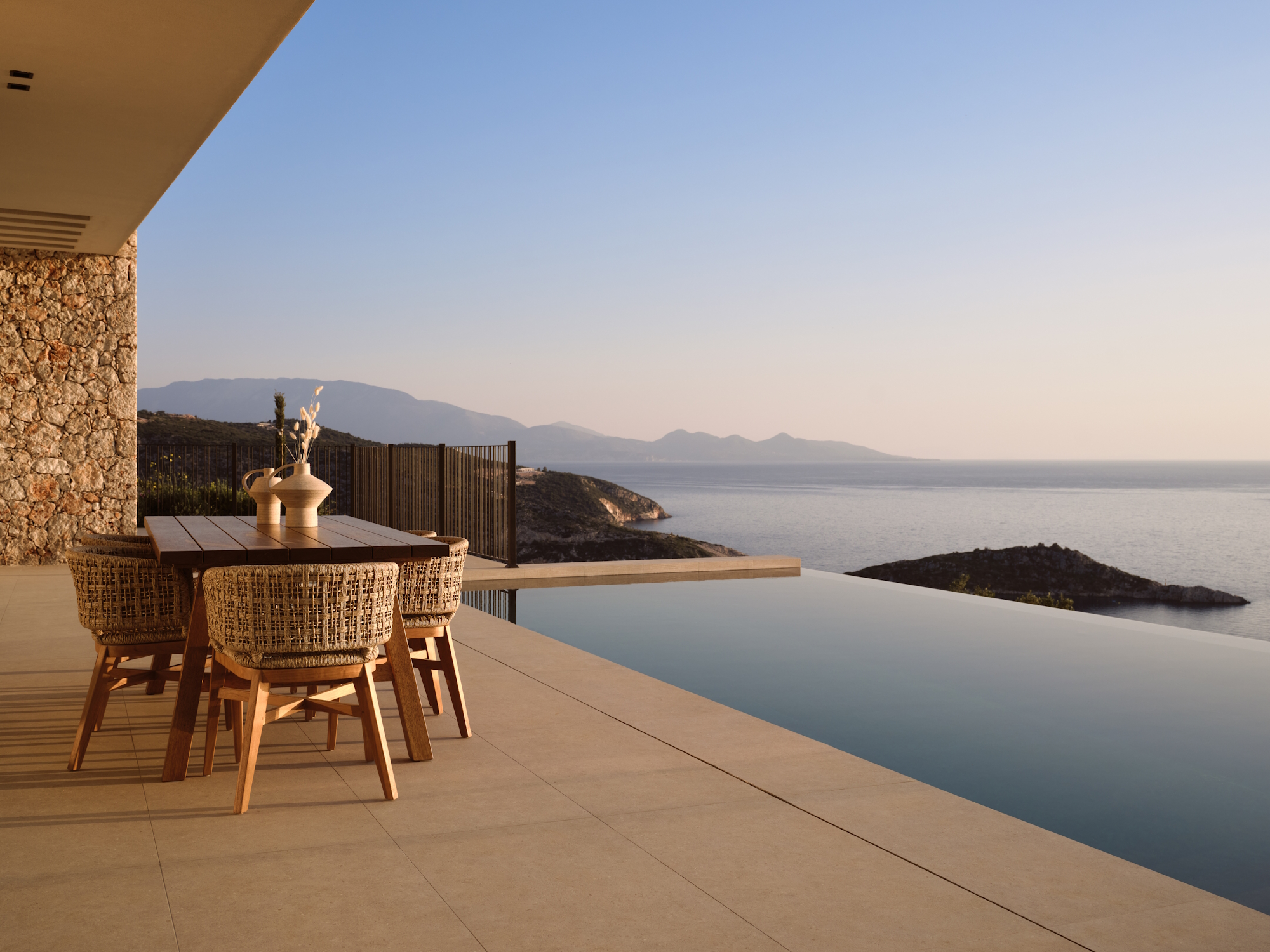 The unique design of each villa’s outdoor space ensures that every moment spent by the pool feels as though you are floating on the sea itself. Whether lounging on the sunbeds or dining al fresco by the water’s edge, the scenery stretches endlessly, offering a sense of tranquility that is hard to find elsewhere. The infinity line draws your eye toward the horizon, offering a calming, meditative experience.